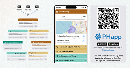 PHapp is a free public health preparedness app that delivers accurate, up-to-date health and safety information from trusted sources like the CDC, NWS, USDA, FDA, FEMA, and your local public health agencies.
